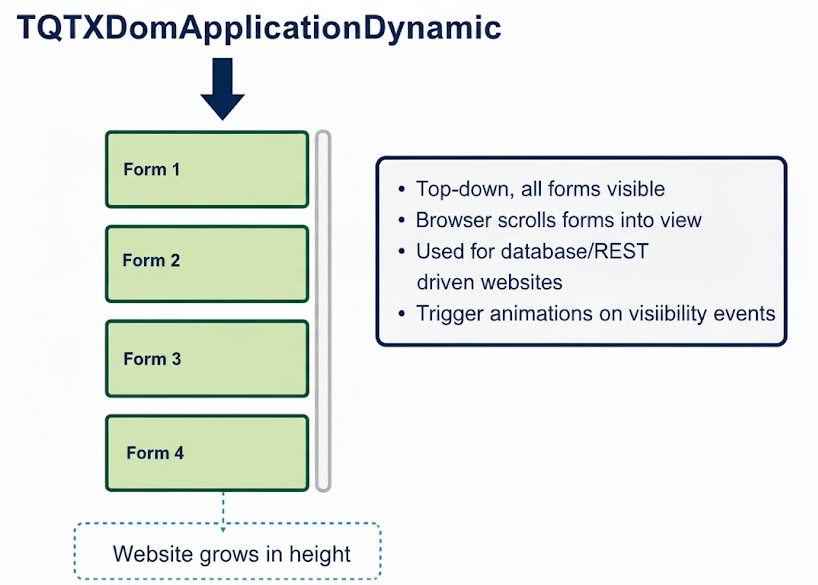 The dynamic model is meant for top-down, all forms visible, website mode. TQTXDomApplicationDynamic will create all your forms and lay them out vertically. When you call ShowForm() under this model - the browser will scroll the form into view, but the form is always visible. This mode can be used to create websites where you adapt the content based on database or REST calls. By resizing a particular form the website grows in height (or length). The standard form events triggers as a form becomes visible or goes out of view, allowing you to trigger animations.